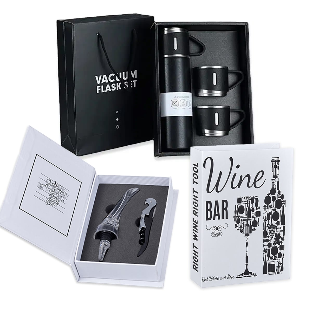 מארז אביזרים לבקבוק יין באריזת מתנה מעוצבת בצורת ספר סט בקבוק טרמי מבודד לשתיה חמה וקרה ושתי כוסות תואמות.