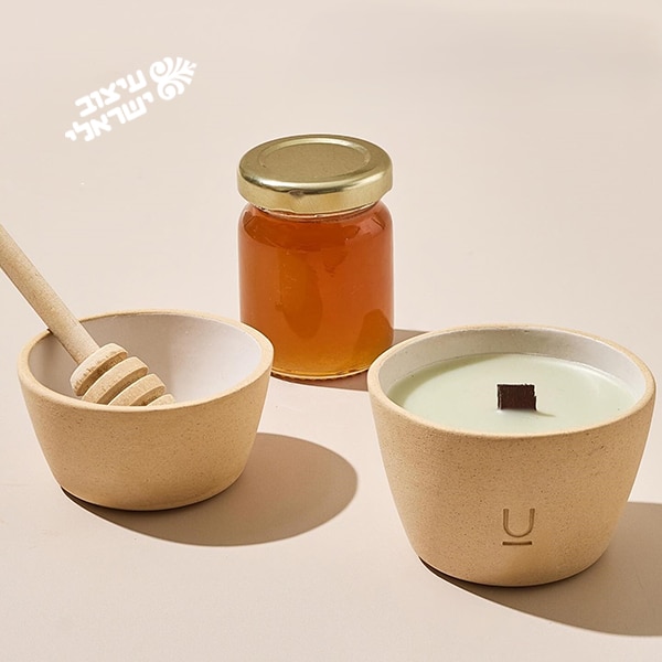 נר תפוח + קערית + מקל דבש + צנצנת דבש 70 גרם